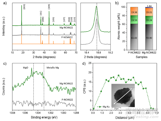 圖2. P-NCM622和Mg-NCM622顆粒的成分表征:(a)粉末X射線衍射圖和放大圖中(003)峰的比較;(b)ICP-MS分析確定的化學(xué)成分;(c)XPS Mg 2s光譜,以及(d)Mg-NCM622中Mg的相應(yīng)EDS線剖面。