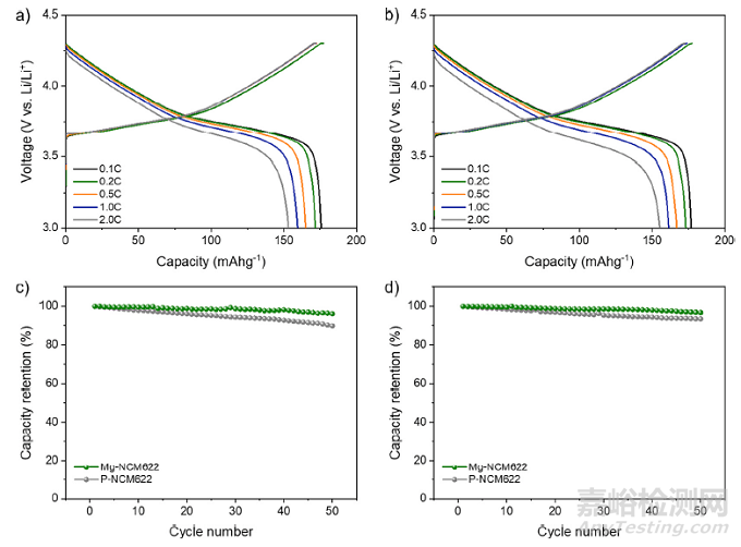 圖3. 對(duì)于(a)P-NCM622和(b)Mg-NCM622,在3.0–4.3 V vs.Li/Li+電壓范圍內(nèi)的恒流電壓分布與不同電流密度下的關(guān)系。在(c)3.0–4.3 V vs.Li/Li+和(d)3.0–4.4 V vs.Li/Li+的電壓范圍內(nèi),P-NCM622和Mg-NCM622在50次循環(huán)期間的容量保持率。