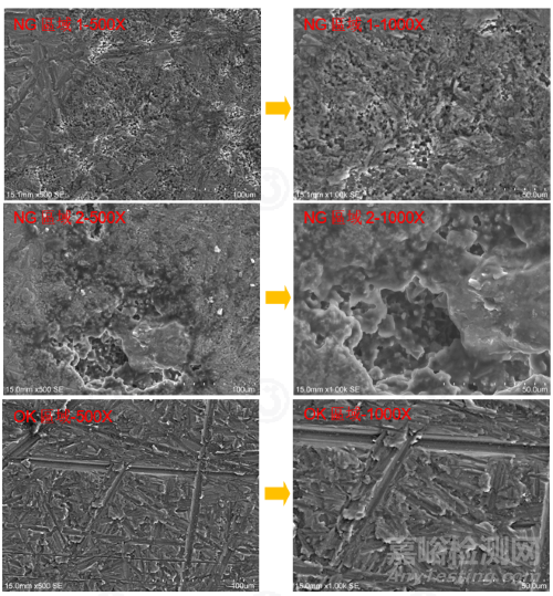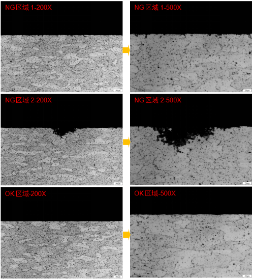 NG區(qū)域截面基材金相組織未見異常,與OK區(qū)域金相組織無明顯差異。