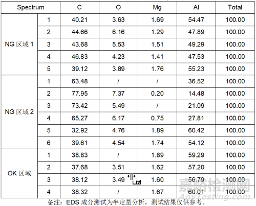 EDS測試結(jié)果表明,NG區(qū)域與OK區(qū)域均含有C、O、Mg、Al元素,其中C含量較高,且NG區(qū)域C含量明顯高于OK區(qū)域,推測C元素來自于殘留在樣品表面的切削液,而腐蝕凹坑及孔洞區(qū)域易殘留更多切削液。