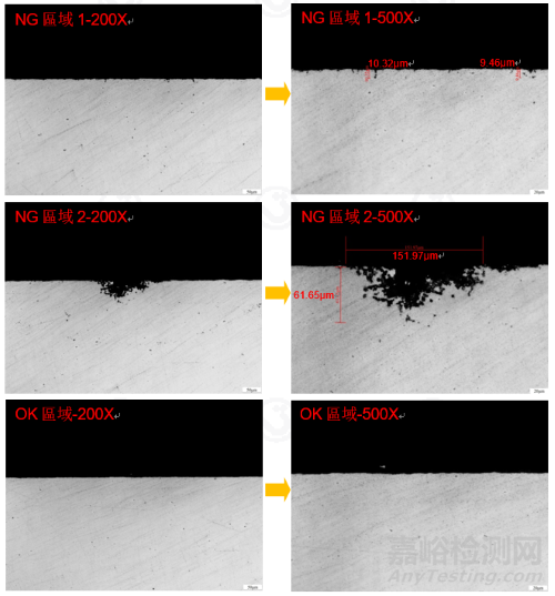 從截面可見NG區(qū)域表面輪廓平滑,未見腐蝕現(xiàn)象;