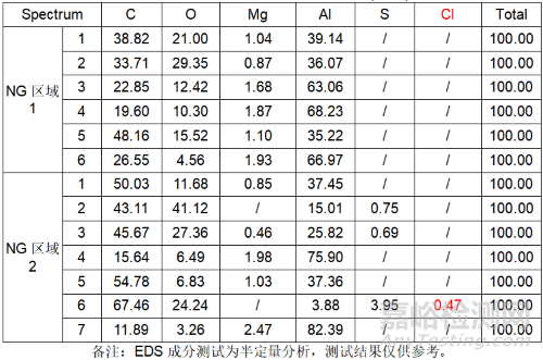 在NG區(qū)域2孔洞內(nèi)除檢測出C、O、Mg、Al元素外,在某些位置還檢測出一定量的S、Cl元素,推測S元素可能來自于切削液中的陰離子,如SO42-等,該類離子對鋁合金腐蝕影響較小,而Cl-具有明顯促進鋁合金腐蝕的作用。
