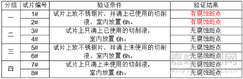 5、實驗室驗證結(jié)果表明,試片接觸不銹鋼片時,在已使用過的切削液中可生成與產(chǎn)品表面相同的腐蝕斑點,無不銹鋼片或滴加未使用過的切削液時未見腐蝕斑點生成;