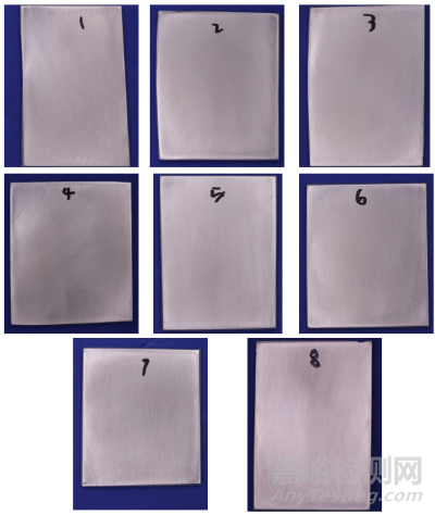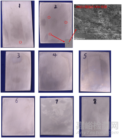 實驗室從客戶提供樣品上切取了8個試片進行驗證實驗,編號分別為1、2、3、4、5、6、7、8,將每個試片用砂紙打磨并分為四組,驗證條件及驗證結(jié)果見表4及圖8、9;