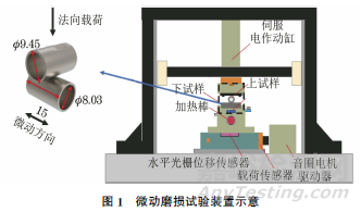 采用課題組自主研發(fā)的全模式高溫微動(dòng)磨損試驗(yàn)機(jī)進(jìn)行切向微動(dòng)磨損試驗(yàn),具體設(shè)備如圖1所示,上下試樣均為Zr-4合金管,接觸模式為點(diǎn)接觸。在微動(dòng)磨損試驗(yàn)過(guò)程中,通過(guò)音圈電機(jī)實(shí)施位移加載,伺服電作動(dòng)缸施加法向載荷,并通過(guò)水平光柵位移傳感器實(shí)時(shí)采集微動(dòng)相對(duì)位移量,摩擦力隨微動(dòng)位移、循環(huán)次數(shù)的響應(yīng)值由壓電式載荷傳感器進(jìn)行實(shí)時(shí)采集,同時(shí)利用外接加熱模塊的溫控器設(shè)定試驗(yàn)溫度,并對(duì)試樣進(jìn)行提前加熱完成高溫試驗(yàn)。試驗(yàn)過(guò)程中的位移幅值為60μm,法向載荷分別為10,40N,試驗(yàn)頻率為5Hz,試驗(yàn)溫度為25,100,200,325℃,循環(huán)次數(shù)為20000周次。