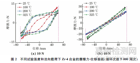 由圖2(a)可知,當(dāng)位移幅值為60μm時(shí),在不同試驗(yàn)溫度和10N法向載荷下,試驗(yàn)合金的摩擦力-位移曲線的形狀為平行四邊形或橢圓形,說(shuō)明在此參數(shù)下微動(dòng)運(yùn)行于完全滑移區(qū)。當(dāng)試驗(yàn)溫度從25℃升高至100℃時(shí),最大摩擦力發(fā)生明顯變化,曲線形狀由平行四邊形變?yōu)闄E圓形,且曲線斜率先減小后增大,說(shuō)明此時(shí)合金表面的接觸剛度先減小后增大;隨著試驗(yàn)溫度的進(jìn)一步升高,曲線形狀又恢復(fù)為平行四邊形。由圖2(b)可知,當(dāng)法向載荷為40N時(shí),不同試驗(yàn)溫度下的摩擦力-位移曲線均為直線形,此時(shí)微動(dòng)處于部分滑移區(qū),當(dāng)試驗(yàn)溫度升高至325℃時(shí),曲線的面積增大,表明此時(shí)相對(duì)滑移量增加;隨著試驗(yàn)溫度的升高,曲線斜率先減小后增大,說(shuō)明接觸剛度先減小后增大。
