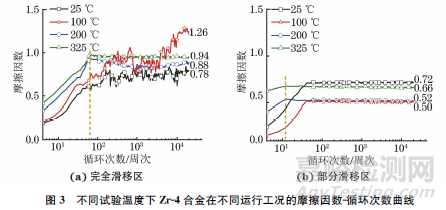 (1) 在完全滑移區(qū),Zr-4合金在25℃時(shí)的摩擦因數(shù)最小,100℃時(shí)摩擦因數(shù)最大,200,325℃時(shí)的摩擦因數(shù)最早達(dá)到穩(wěn)定狀態(tài);在部分滑移區(qū),25℃的摩擦因數(shù)最大,隨試驗(yàn)溫度升高,摩擦因數(shù)先下降后增大,200,325℃時(shí)的摩擦因數(shù)最早達(dá)到穩(wěn)定狀態(tài)。在相同試驗(yàn)溫度下,部分滑移區(qū)的摩擦因數(shù)均小于完全滑移區(qū),且摩擦因數(shù)的變化較平穩(wěn)。