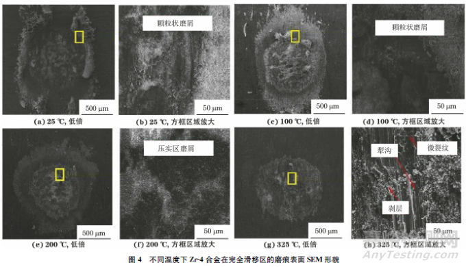 由圖4可以看出:在完全滑移區(qū),25℃下試驗(yàn)合金磨痕表面磨屑堆積嚴(yán)重,磨痕四周有大量細(xì)小顆粒狀磨屑分布;當(dāng)試驗(yàn)溫度升高至100℃時(shí),磨屑的堆積更為嚴(yán)重,磨屑被壓實(shí)形成磨屑層,磨屑顆粒變細(xì);200℃下磨痕邊緣位置細(xì)小顆粒狀磨屑減少,邊緣與中心位置過(guò)渡處有微動(dòng)滑移痕跡,并出現(xiàn)在基體表面,說(shuō)明溫度的升高導(dǎo)致磨屑的聚集程度增加,分散的磨屑減少,磨痕中心出現(xiàn)少量剝落坑和犁溝;當(dāng)試驗(yàn)溫度升高至325℃時(shí),材料膨脹使得試樣間接觸緊密,磨屑無(wú)法及時(shí)排出接觸區(qū),邊緣位置處觀察不到磨屑,此時(shí)上下試樣接觸表面相對(duì)滑動(dòng),受高溫影響磨痕區(qū)域出現(xiàn)材料的塑性流動(dòng)特征,磨痕中心剝層嚴(yán)重,出現(xiàn)少量微裂紋以及較多的犁溝。