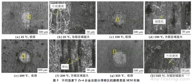 由圖5可以看出,在部分滑移區(qū),磨痕呈現(xiàn)出明顯的中心黏著區(qū)和邊緣滑移區(qū),符合典型的部分滑移區(qū)微動(dòng)損傷形貌特征。25℃時(shí)磨痕損傷輕微,黏著區(qū)和滑移區(qū)的界線不明顯,磨屑堆積形成片狀磨屑;當(dāng)試驗(yàn)溫度升高至100℃時(shí),可以明顯觀察到黏著區(qū)和滑移區(qū)的界線,磨痕中心位置的黏著磨損加劇,有少量剝落坑形成;200℃時(shí),邊緣滑移區(qū)占比增大,黏著區(qū)有磨屑堆積現(xiàn)象,表面發(fā)生塑性變形和材料塑性流動(dòng);325℃時(shí)磨痕面積增大,損傷加劇,表面幾乎觀察不到顆粒狀磨屑的存在。可知,完全滑移區(qū)的磨損機(jī)制為剝層、磨粒磨損和氧化磨損,溫度的升高對(duì)合金微動(dòng)磨損程度的影響較大,325℃下試驗(yàn)合金的微動(dòng)損傷程度最大;部分滑移區(qū)則主要以剝層、黏著磨損和氧化磨損為主,隨著試驗(yàn)溫度的升高,試驗(yàn)合金的微動(dòng)損傷整體變化不大。