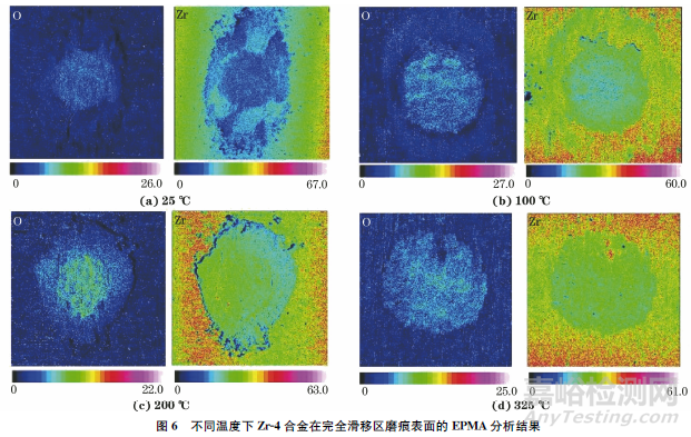 由圖7可以看出:在部分滑移區(qū),不同溫度下試驗(yàn)合金磨痕表面氧元素的分布均呈現(xiàn)出明顯的環(huán)狀特征,即磨痕邊緣形成了一個(gè)富氧、貧鋯的環(huán)狀區(qū)域;而磨痕中心為富鋯、貧氧,且25,325℃時(shí)該現(xiàn)象最明顯。這與部分滑移區(qū)中間黏著邊緣滑移的特征相符。邊緣由于摩擦磨損產(chǎn)生的活化作用,促進(jìn)了氧化反應(yīng)的進(jìn)行,而中心由于未發(fā)生相對(duì)滑移,使得氧化現(xiàn)象并不顯著。