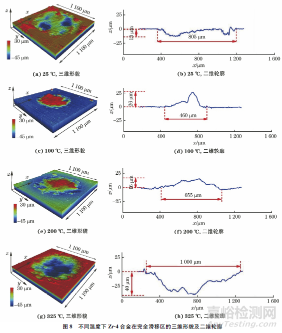 由圖8可知:在完全滑移區(qū),25℃時(shí)試驗(yàn)合金磨痕在x方向的最大深度為13μm,磨痕寬度為750μm;100,200℃時(shí)磨痕表面有明顯的凸起,且100℃時(shí)的凸起高度更大,這可能是由大量磨屑堆積造成的,磨痕寬度分別為460μm和655μm;當(dāng)試驗(yàn)溫度升高至325℃時(shí),磨痕輪廓與25℃時(shí)相同,為明顯的“U”形,但此時(shí)的磨痕在x方向的最大深度為40μm,為25℃時(shí)的3倍左右,同時(shí)磨痕的寬度最大,達(dá)到1000μm。在完全滑移區(qū),溫度的升高使試驗(yàn)合金表面軟化嚴(yán)重,加重微動(dòng)磨損的同時(shí)容易發(fā)生材料轉(zhuǎn)移。