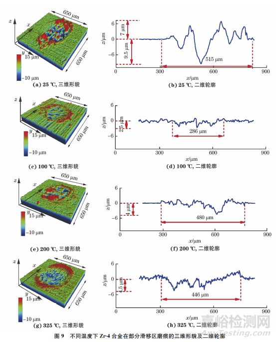 由圖9可以看出:在部分滑移區(qū),25 ℃時(shí)磨痕在x 方向的最大深度為9.5μm,凸起高度為7μm,磨痕寬度為515μm,此時(shí)上下試樣接觸區(qū)域的中間發(fā)生黏著;100℃時(shí)磨痕的最大深度僅為2.5μm,為25℃時(shí)的1/4左右,磨痕寬度為286μm;試驗(yàn)溫度繼續(xù)升高至325℃,磨痕的最大深度變化不大,寬度增至446μm。在部分滑移區(qū),試驗(yàn)溫度的升高使試驗(yàn)合金中間的黏著加劇,邊緣的滑移減輕,但整體變化較小。