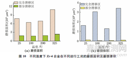 由圖10可以看出:在完全滑移區(qū),隨著試驗(yàn)溫度的升高,試驗(yàn)合金的磨損面積先減小后增大,325℃時(shí)的磨損面積最大,為1099098.624μm2,100℃時(shí)的磨損面積最小,僅為649255.04μm2,是325℃時(shí)的1/2;在部分滑移區(qū),隨著溫度的升高,磨損面積相差較小,325℃的磨損面積最大,為237506.256μm2,100℃時(shí)的磨損面積最小,為179315.136μm2。在完全滑移區(qū),325℃時(shí)的磨損體積最大,為3417417.728μm3,100℃時(shí)的次之,為3050682.624μm3,25℃和200℃時(shí)的磨損體積較小,約為100℃的1/2;在部分滑移區(qū),25℃時(shí)的磨損體積最大,100℃時(shí)的磨損體積最小,為34607.856μm3,僅為25℃時(shí)的1/3??梢钥闯觯谙嗤瑴囟认?,部分滑移區(qū)的微動(dòng)磨損程度遠(yuǎn)低于完全滑移區(qū)。試驗(yàn)溫度的升高對(duì)完全滑移區(qū)微動(dòng)磨損程度的影響較明顯,而對(duì)部分滑移區(qū)的影響不大。