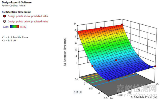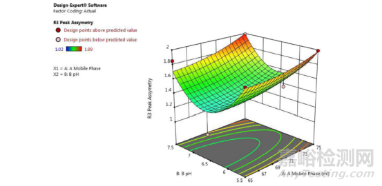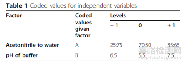 文章使用Design Expert 軟件設(shè)計了一個2因素(流動相和pH值)、3個不同水平試驗,這是最適合二階多項式用于二次響應(yīng)面的設(shè)計。
