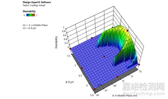 在確定了QTPP和CQAs后,采用中心復(fù)合試驗設(shè)計(CCD)對HPLC方法的流動相和pH值這兩個關(guān)鍵參數(shù)進(jìn)行選擇和優(yōu)化。