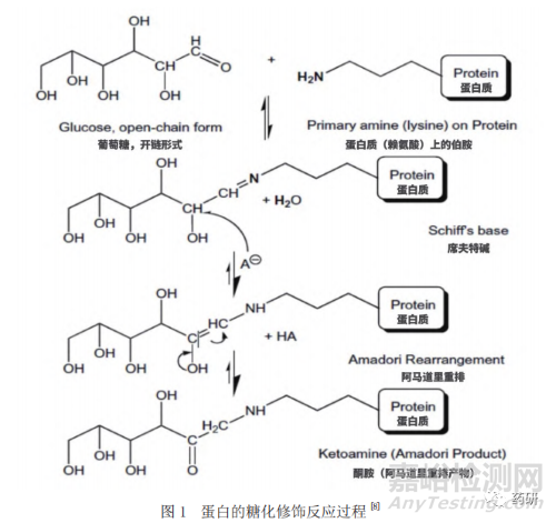 蛋白質的糖化通常主要發(fā)生在賴氨酸的α氨基和ε氨基末端上,當?shù)鞍踪|與還原型的糖孵育時,通過非酶促反應,還原型的糖會共價結合至賴氨酸上,這一反應最初由Maillard于1912年提出,因此被稱為Maillard反應(圖1)。該反應首先由蛋白質賴氨酸上的氨基與還原性糖的醛基發(fā)生可逆的縮合反應,形成一種不穩(wěn)定的席夫堿(SchiffBase)中間體,這一中間體可通過自發(fā)的Amadori重排生成更加穩(wěn)定的共價結合的酮胺,從而完成了蛋白質的糖化過程[8]。與此同時,糖化修飾在特定的情況下是可逆的,研究發(fā)現(xiàn)將高度糖化的單抗在pH 7.0的磷酸鹽緩沖液中37 ℃孵育100小時后,其糖化水平由42%下降至20%,表明了糖化的可逆性[9]。