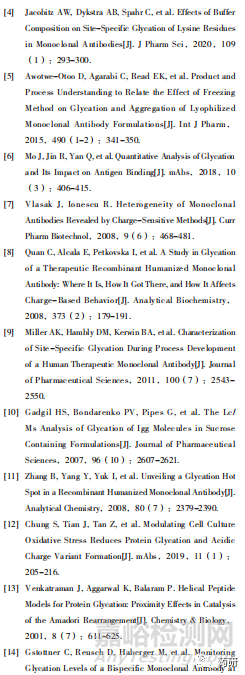 糖化作為單抗常見的翻譯后修飾,在單抗生產、儲存、臨床使用以及注射入人體后均會發(fā)生,同時糖化不僅會影響單抗的電荷異質性,也可能影響聚集體的產生,并對單抗的功能活性、免疫原性等產生影響,然而目前在單抗質量研究及可比性評價中通常缺乏對糖化的研究評價。由于糖化對單抗的影響取決于單抗序列、結構等因素,對不同單抗的影響存在差異,因此在單抗研發(fā)時應充分評估糖化的影響并確定是否為關鍵質量屬性,對于生物類似藥也應根據(jù)單抗分子特性按照ICH Q9風險評估原則開展相應的糖化可比性評價。根據(jù)風險評估和質控需求,可以選擇對單抗的糖化比例(完整分子水平、亞單位水平或肽段水平)、糖化位點以及分布等進行質控評價,也可以在充分表征后在電荷水平上控制糖化的批間一致性。對于糖化是CQA的單抗品種,應結合分子設計、生產工藝優(yōu)化、質控檢測等手段對其進行有效的控制和監(jiān)測,保證批間一致性。