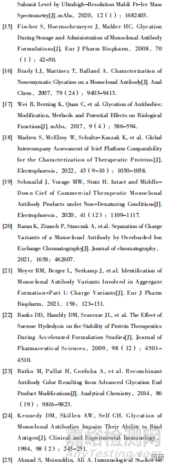 由于糖化對單抗的活性、異質性等方面可能產生潛在的影響,因此需要對其進行充分的表征和測定。目前,糖化分析方法主要有硼酸親和色譜(BAC)、基于電荷差異分離的方法(如離子交換色譜、毛細管等電聚焦電泳等)、硝基四氮唑藍還原試驗(NBT Reduction Assay)和液質聯(lián)用(LCMS)等[16]。