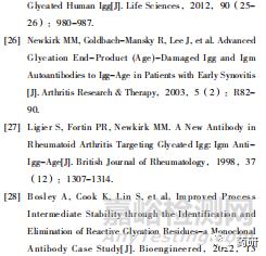 糖化對單抗免疫原性的潛在影響主要由糖化晚期終末端產物AGE引起。研究發(fā)現(xiàn)AGE形式單抗的免疫原性顯著強于正??贵w,相比于正??贵w,可在動物體內產生針對AGE的高滴度特異性抗體[25],而在類風濕關節(jié)炎患者體內也能檢測到針對AGE的高滴度IgM抗體[26-27]。盡管在優(yōu)化的抗體生產工藝下,單抗發(fā)生AGE形式的糖化修飾比例較低,但糖化的單抗在進入體內循環(huán)過程中,在高血糖及氧化等環(huán)境下,仍能產生AGE形式的糖化修飾。另一方面,糖化引起的抗體聚集也會增加免疫原性。除此之外,AGE形式的蛋白還會在體內誘導AGE特異性細胞受體的表達,同時還會引發(fā)蛋白的交聯(lián)和聚集,而這種非天然形式的蛋白也會對多種細胞產生毒性并引發(fā)疾病。