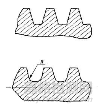 如圖1所示,螺栓螺紋與光桿過渡區(qū)是重要的疲勞源之一,嚴格按收尾尺寸控制過渡區(qū)形狀是提高該區(qū)域疲勞壽命的重要措施。因此,在設計制造滾絲輪時,必須按標準嚴格修磨收尾處,且在滾絲時嚴格控制滾絲位置。具體措施可采用較大的過渡圓角見圖3a,切制卸載結構見圖3b、圖3c,螺紋收尾處切制退刀槽也可減少應力集中(圖3b和3c的示意圖有明顯的誤導作用。增大過渡區(qū)域的圓角,的確有緩和局部應力集中的作用)。