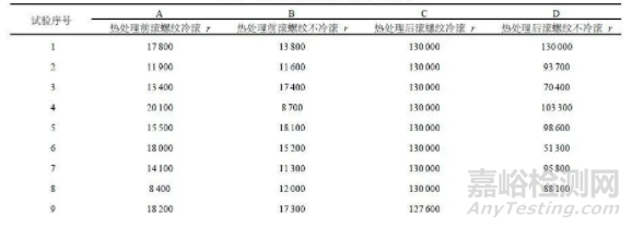從表1可知,熱處理后滾螺紋再冷滾螺栓轉(zhuǎn)角處圓角r(見圖1)的抗拉疲勞性能最好。冷擠r的值要求不嚴格,技術條件只規(guī)定了變形量上限。