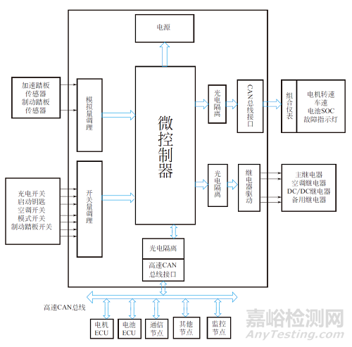 下圖為某公司開發(fā)的純電動汽車整車控制器組成原理圖。整車控制器的硬件電路包括微控制器、開關(guān)量調(diào)理、模擬量調(diào)理、繼電器驅(qū)動、高速CAN總線接口、電源等模塊。