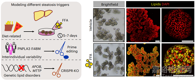 在這項(xiàng)研究中,研究團(tuán)隊(duì)建立了三種類器官模型來捕捉脂肪肝發(fā)展的不同觸發(fā)因素。首先,他們用脂肪酸混合物來模擬西式飲食,并見證了脂肪肝類器官的快速發(fā)展。然后,研究團(tuán)隊(duì)使用了先導(dǎo)編輯(Prime Editing)將脂肪肝的最高風(fēng)險(xiǎn)基因突變(PNPLA3 I148M)引入類器官系統(tǒng),具有這種突變的類器官比沒有這種突變的類器官顯示出更嚴(yán)重的脂肪積累。最后,研究團(tuán)隊(duì)使用CRISPR-Cas9模擬了遺傳脂質(zhì)疾病,以研究這些疾病如何影響脂肪肝的發(fā)展,由于糖源性脂肪的積累,這些突變的類器官自發(fā)地發(fā)展成嚴(yán)重的脂肪肝。