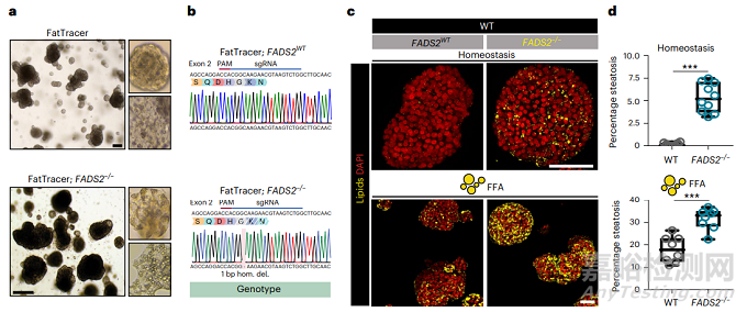 使用這一FatTracer篩選平臺(tái),研究團(tuán)隊(duì)對(duì)35個(gè)脂質(zhì)代謝和/或NAFLD有關(guān)的候選基因進(jìn)行了篩選,發(fā)現(xiàn)FADS2基因(表達(dá)脂肪酸去飽和酶2)是一個(gè)新的與脂肪肝疾病相關(guān)的關(guān)鍵基因,F(xiàn)ADS2基因的缺失使得類器官的脂肪含量大大增加。