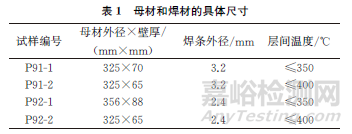 P91鋼管和P92鋼管的坡口均為U型坡口,焊前預(yù)熱溫度為200~250℃,手工鎢極氬弧焊裝點(diǎn)并打底,焊條采用手工電弧焊過渡,其余部分采用埋弧自動焊,焊接速率為20cm/min~50cm/min,焊后熱處理溫度為(760±10)℃,保溫時間為5h。母材和焊材的具體尺寸如表1所示。