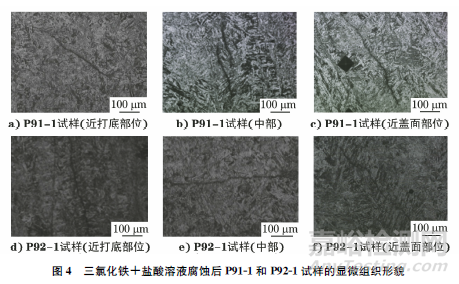 將P91-1和P92-1試樣經(jīng)三氯化鐵+鹽酸溶液腐蝕后,在光學(xué)顯微鏡下觀察,結(jié)果如圖4所示。由圖4可知:P91-1和P92-1試樣全焊縫范圍內(nèi)均可見黑線,主要分布于柱狀晶之間,但非均勻分布,且黑線長度為0.05~2mm。