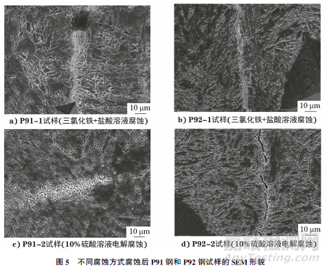 (2) P91鋼和P92鋼焊接冶金過程中,Cr和Mo等元素在柱狀晶之間偏聚,并在焊后熱處理時以M23C6碳化物的形式在柱狀晶晶界析出,呈線狀排列,腐蝕后在光學(xué)顯微鏡下呈現(xiàn)黑色。