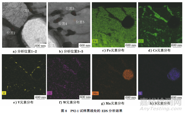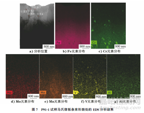對P91-1試樣馬氏體板條束形貌處進(jìn)行EDS分析,結(jié)果如圖7所示,可見位置1和5處析出物含有大量Cr、Mo、Mn、V等元素,遠(yuǎn)高于基體(位置2~4)處。