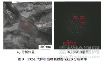 對P92-1試樣黑線處進(jìn)行EDS分析,結(jié)果如圖8所示,可見黑線處有大量顆粒狀析出物,析出物(位置1~2)的Cr、Mo、W等元素含量遠(yuǎn)高于基體(位置5)處,與晶界析出物(位置3)基本相同,析出物為M23C6[5-6]。選取了其中的較大析出物顆粒進(jìn)行SAED分析,結(jié)果如圖9所示,可見析出物為面心立方結(jié)構(gòu)。