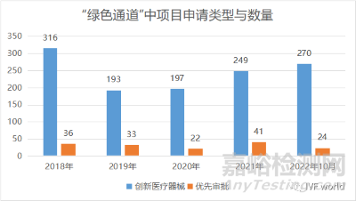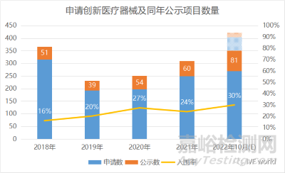 創(chuàng)新醫(yī)療器械申請熱情不減,申請量逐年提升。2018年至2022年10月,CDE分別收到316份、193份、197份、249份及270份申請,而同年公示進入創(chuàng)新通道的醫(yī)療器械分別對應51個、39個、54個、60個和81個。