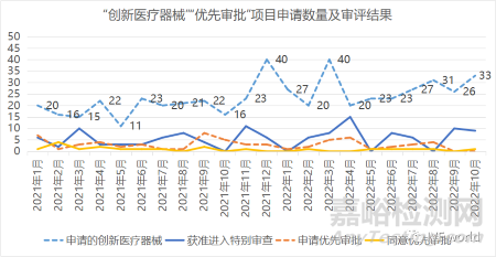 從上表我們可以看到,每年“創(chuàng)新醫(yī)療器械”基本保持數(shù)百申請量,而“醫(yī)療器械優(yōu)先審批”申請量基本都是幾十項;平均來看,創(chuàng)新醫(yī)療器械的申請量是優(yōu)先審批的7倍以上,在2022年(官方數(shù)據(jù)更新至2022年10月)這個倍差達到最大的11.25倍。
