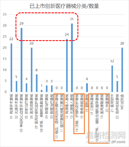 而目前還沒有“10 輸血、透析和體外循環(huán)器械 11 醫(yī)療器械消毒滅菌器械 14 注輸、護理和防護器械 15 患者承載器械 17 口腔科器械 18 婦產(chǎn)科、輔助生殖和避孕器械 19 醫(yī)用康復器械20 中醫(yī)器械”這九大類的創(chuàng)新醫(yī)療器械產(chǎn)品上市,具體原因此處就不做分析了。