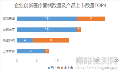 創(chuàng)新醫(yī)療器械數(shù)量最多的TOP4企業(yè)分別是微創(chuàng)集團、品馳醫(yī)療、先健科技、上海聯(lián)影。