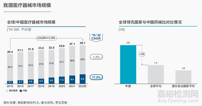 2022年我國醫(yī)療器械市場規(guī)模預(yù)計(jì)達(dá)9,582億元人民幣,近7年復(fù)合增速約17.5%,已躍升成為除美國外的全球第二大市場。但從藥械比角度看,我國目前藥械比水平僅為2.9,與全球平均藥械比1.4的水平仍有一定差距,表明我國醫(yī)療器械市場未來存在較大的增長空間。