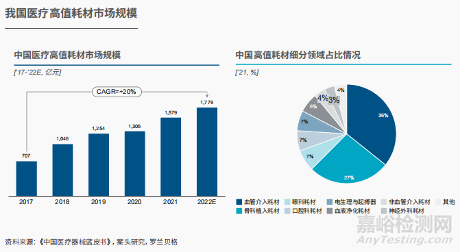 高值醫(yī)用耗材主要指對安全至關(guān)重要、生產(chǎn)使用必須嚴(yán)格控制、限于某些專科使用且價(jià)格相對較高的消耗性醫(yī)療器械。據(jù)統(tǒng)計(jì),2022年我國高值耗材市場規(guī)模約1,779億元,近6年復(fù)合增長率約為20%。血管介入類與骨科植入類耗材占據(jù)了主要市場地位。
