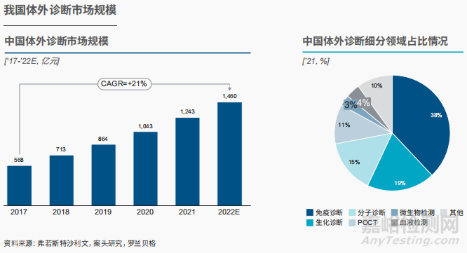 2022年我國體外診斷市場規(guī)模預(yù)計(jì)約1,460億元,近6年復(fù)合增速約為21%。其中生化診斷、免疫診斷與分子診斷累計(jì)占比約72%市場份額,是體外診斷最核心的三大技術(shù)領(lǐng)域。