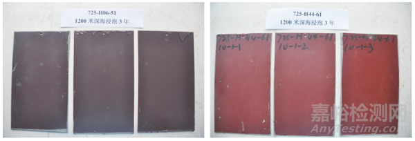 目前國內(nèi)針對深海裝備防腐涂料的實(shí)際應(yīng)用較少,研究主要集中于實(shí)驗(yàn)室內(nèi)分析深海防腐涂料的失效機(jī)理與失效性能評價(jià)。中船重工七二五研究所工作人員針對兩種防腐涂層(725-H06-51和725-H44-61),在南海800m和1200m深的水域開展了3 a的深海掛片試驗(yàn),回收后的試驗(yàn)樣板如圖2所示。樣板在實(shí)海中浸泡3 a后,涂層表面完整,漆膜無起泡、無裂紋、無脫落。