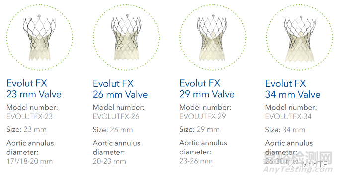 其它Evolut FX 與Evolut TAVR前三代一樣都采用自膨式鎳鈦合金瓣架設(shè)計(jì)以適應(yīng)原生瓣環(huán)具有一致的徑向力和先進(jìn)的密封性。并且與第三代Evolut PRO+一樣,擁有四個(gè)不同瓣膜尺寸,其中23mm,26mm和29mm的瓣膜能夠通過(guò)5mm血管,34mm的瓣膜能夠通過(guò)6mm的瓣膜。