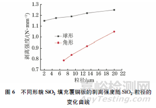 由圖6可以看出,球形與角形SiO2填充覆銅板的剝離強(qiáng)度均隨著SiO2粒徑的增大而升高,且球形SiO2填充覆銅板的剝離強(qiáng)度較高。覆銅板的剝離強(qiáng)度主要與樹脂的黏結(jié)作用有關(guān);球形SiO2顆粒表面在樹脂固化過程中與銅箔的接觸類型為點(diǎn)接觸,而角形SiO2顆粒與銅箔的接觸類型為面接觸,點(diǎn)接觸下樹脂基體接觸銅箔面積較大,黏結(jié)性較強(qiáng),因此剝離強(qiáng)度更高。球形SiO2填充覆銅板的剝離強(qiáng)度隨粒徑增大而升高的幅度很小,原因在于球形SiO2粒徑的減小對(duì)銅箔與樹脂基體接觸面積產(chǎn)生的影響較小。