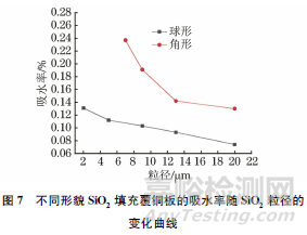 由圖7可見:球形SiO2填充覆銅板的吸水率低于角形SiO2填充覆銅板,這是由于球形SiO2填料被樹脂基體包覆較好,界面較少,水分子難以進(jìn)入,而角形SiO2填料與樹脂基體間界面較多,水分子容易進(jìn)入所致;2種形貌SiO2填充覆銅板的吸水率均隨著SiO2粒徑的減小而表現(xiàn)出增加的趨勢(shì)。膠層分散情況、玻纖布的浸漬情況、膠層與玻纖布的結(jié)合情況越優(yōu)異,覆銅板的吸水率越低。隨著SiO2粒徑的減小,比表面積增大,單位體積內(nèi)與樹脂基體形成的界面面積增多,更容易產(chǎn)生界面缺陷,導(dǎo)致水分更容易進(jìn)入覆銅板中,因此吸水率增大。