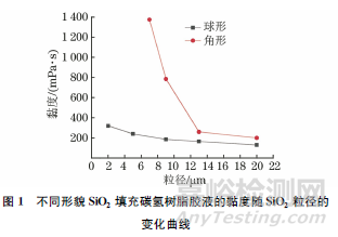由圖1可知:相同粒徑下球形SiO2填充膠液的黏度低于角形SiO2填充膠液黏度,分析認(rèn)為由于在相同體積下球形顆粒具有較小的比表面積,比表面積越小,填料對(duì)樹脂的吸收量越小,膠液的黏度越小;隨著SiO2粒徑的增大,膠液黏度呈下降趨勢(shì),這也歸因于填料顆粒的粒徑越大,比表面積越小,吸收樹脂的量越少。