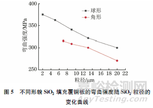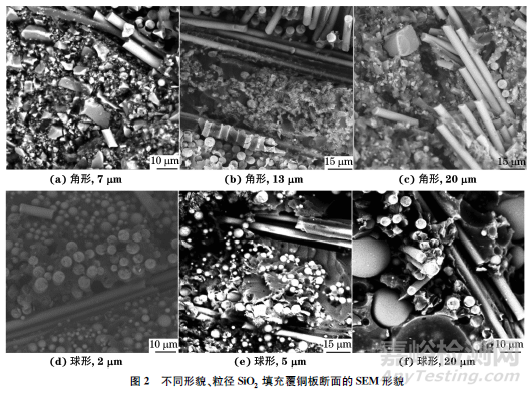 由圖5可見:不同形貌SiO2填充覆銅板的彎曲強(qiáng)度均隨著SiO2粒徑的減小而升高,這是由于隨著顆粒粒徑的減小,玻纖布與填料及樹脂形成的三維網(wǎng)狀結(jié)構(gòu)更致密;與角形SiO2填充覆銅板相比,相同粒徑下球形SiO2填充覆銅板的彎曲強(qiáng)度更高,這是由于球形顆粒的比表面積較小,聚丁二烯樹脂對(duì)SiO2的包覆性較好,界面缺陷大幅度減少導(dǎo)致的。