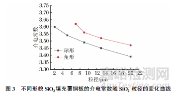 (2) 當(dāng)SiO2粒徑在2~20μm范圍時(shí),隨著SiO2粒徑的增大,球形和角形SiO2填充碳?xì)錁渲层~板的介電常數(shù)、介電損耗、彎曲強(qiáng)度、吸水率均降低,剝離強(qiáng)度升高。