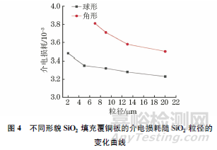 介電常數(shù)是指物質(zhì)保持電荷的能力;保持電荷能力越強(qiáng),極化程度越高,介電常數(shù)越大。由圖3可見:在5GHz下,角形和球形SiO2填充覆銅板的介電常數(shù)均隨著SiO2粒徑的增大而減小,這是因?yàn)殡S著粒徑增大,比表面積減小,單位體積內(nèi)的界面面積減小,界面極化作用減弱,極化程度降低,在外電場(chǎng)作用下保持電荷能力減弱,所以介電常數(shù)減??;角形SiO2填充覆銅板的介電常數(shù)比球形SiO2填充覆銅板要高,這是因?yàn)榻切晤w粒形狀不規(guī)則,在覆銅板中分布易雜亂,導(dǎo)致界面比例升高,產(chǎn)生更高程度的界面極化,所以介電常數(shù)增大。
