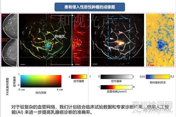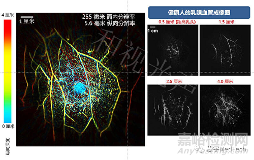 人體乳腺光聲成像系統(tǒng)(SBH-PACT)可以顯示人體乳房的詳細血管結(jié)構(gòu)。SBH-PACT可實現(xiàn)人體內(nèi)4厘米深度的組織成像,具有極高的空間分辨率和時間分辨率(255 μm 平面分辨率和10 Hz 的2D幀速率)。通過掃描整個乳房(屏氣15秒),獲得3D立體圖像,可以忽略呼吸引起的運動偽影。適合成像的乳房大小從A到DD,也適合各種不同膚色的患者。SBH-PACT通過血管密度的異常來找出腫瘤組織。除了血管成像之外,SBH-PACT的高成像速度可以進行動態(tài)研究,如光聲彈性成像,它通過顯示與正常彈性的不符來提供腫瘤的二次確認。
