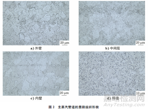 分別在蒸汽管道母材、焊縫附近位置取金相檢驗(yàn)試樣,取樣位置如圖1所示。對(duì)所取試樣進(jìn)行打磨、拋光后,用4%(體積分?jǐn)?shù))硝酸乙醇熔液進(jìn)行腐蝕,利用光學(xué)顯微鏡分別觀察管道外壁、中間層、內(nèi)壁、焊縫區(qū)域的顯微組織。在管道母材的縱向取樣,用萬能疲勞試驗(yàn)機(jī)對(duì)試樣進(jìn)行室溫(20.1℃)和高溫(540℃)拉伸試驗(yàn),每組試驗(yàn)取2個(gè)試樣。在管道母材的縱向取樣,用高溫蠕變持久試驗(yàn)機(jī)測試試樣的高溫蠕變持久強(qiáng)度,測試應(yīng)力為120~220MPa,測試溫度為520~580℃,溫度間隔為20℃。
